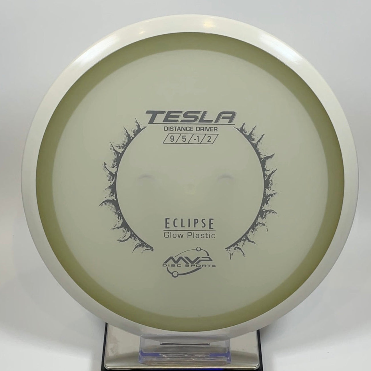 The MVP Tesla in Eclipse plastic is a reliable, slightly overstable driver that handles power well and flies with a tight, controlled S-curve. Great for forehands or backhands when you need distance with precision. The full glow rim lights up like a champ—perfect for night bombs.